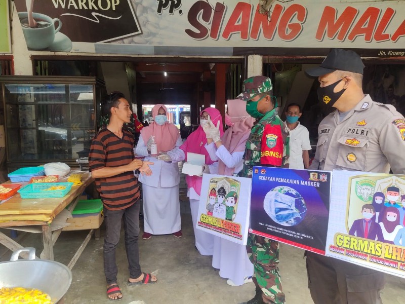 LHOKSEUMAWE- Personil Polsek Muara Batu bersama instansi terkait melakukan patroli cegah penyebaran virus covid-19 dimasa Adaptasi Kebiasaan Baru (AKB) di wilayah hukum Polsek Muara Batu