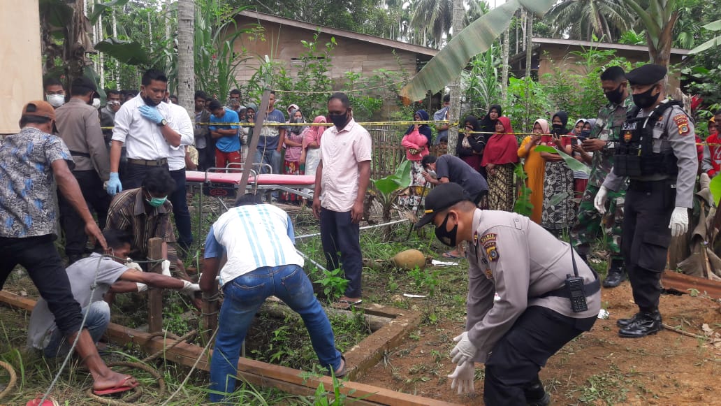 Setelah diberi garis polisi, kemudian sesuai protokol kesehatan petugas melakukan evakuasi mayat dari sumur ke Puskesmas Nisam Antara untuk dilakukan Visum Et revertum dan cek medis.