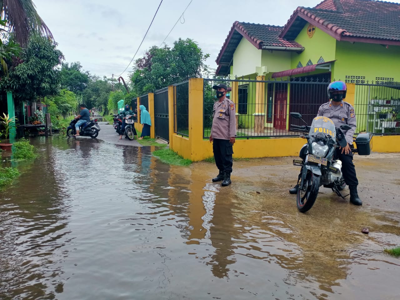 LHOKSEUMAWE – Bersama perangkat desa, personel Polsek Dewantara, Polres Lhokseumawe memantau desa – desa yang rawan banjir, Minggu (6/12/2020). Hasilnya, rata – rata air hanya menggenangi halaman rumah warga.