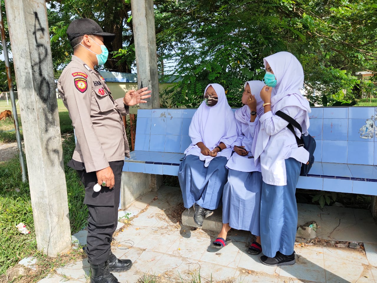 LHOKSEUMAWE – Personel Polsek Blang Mangat melaksanakan patroli rutin pendisiplinan protokol kesehatan terhadap pelajar dan mengimbau untuk tetap mematuhi protokol kesehatan, Selasa (8/12/2020).