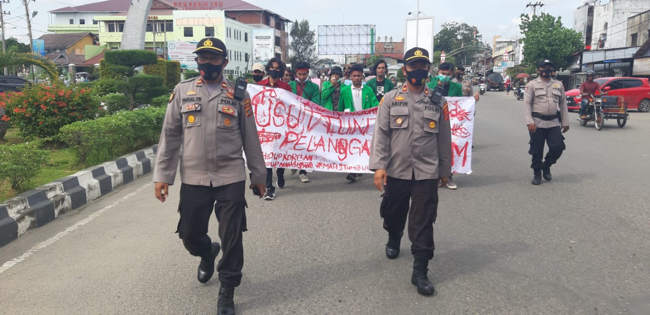 LHOKSEUMAWE – Aksi peringatan Hari Hak Asasi Manusia (HAM) di Kota Lhokseumawe yang dilakukan oleh Ormawa Unimal mendapat pengawalan ketat personel Polsek Banda Sakti, Polres Lhokseumawe, Kamis (10/12/2020).
