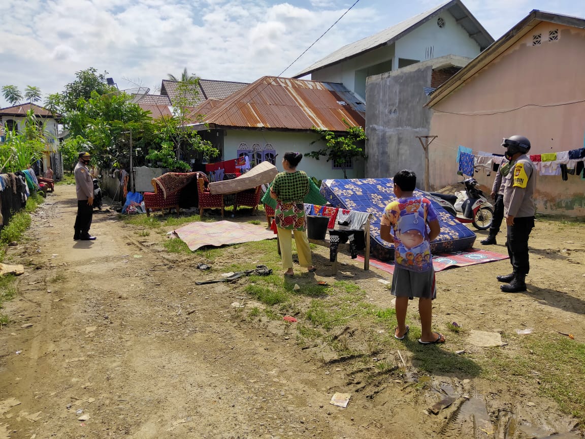 Personel Polsek Blang Mangat, memantau perkembangan pasca banjir di Desa Kumbang Punteut