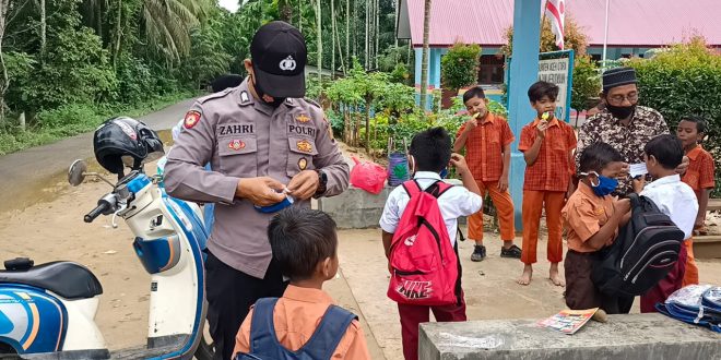 LHOKSEUMAWE – Personel Polsek Kuta Makmur, Polres Lhokseumawe menyambangi Sekolah Dasar (SD) Negeri 6 Kuta Makmur, Kamis (3/12/2020), kegiatan tersebut guna memantau penerapan protokol kesehatan di sekolah tersebut.