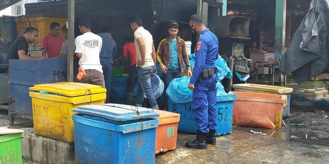 LHOKSEUMAWE – Pol Airud Polres Lhokseumawe melakukan patroli guna mengantisipasi peredaran ikan berformalin di pasar Pusong, Kecamatan Banda Sakti, Kota Lhokseumawe, Jumat (22/1/2021).