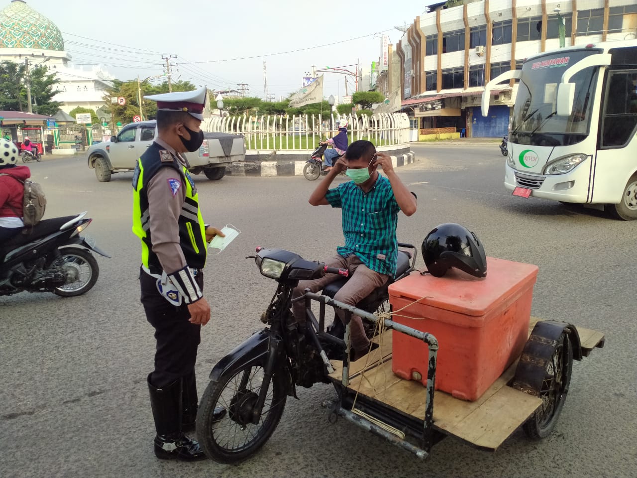 “Personil membagikan masker kepada.para pengguna kendaraan yang tidak mengenakannya. Selain itu, juga dibagikan kepada masyarakat yang memakai, tetapi tidak memiliki cadangan masker,” ujar Kasat Lantas.
