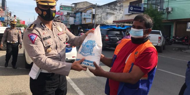 BANDA ACEH – Personel Direktorat Lalu Lintas Polda Aceh, Rabu (27/01/2021) membagikan masker dan sembako kepada 100 tukang parkir yang bertugas di Kota Banda Aceh.