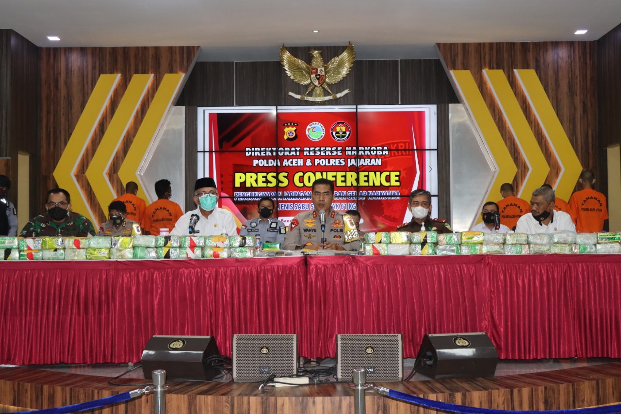 Banda Aceh – Kepala Kepolisian Daerah Aceh Irjen Pol Drs. Wahyu Widada, M. Phil, Rabu (06/01/2021) memimpin konferensi pers terkait pengungkapan kasus narkotika jenis sabu jaringan internasional seberat 61.000 gram (61 kg) yang bertempat di Aula Serbaguna Mapolda Aceh.