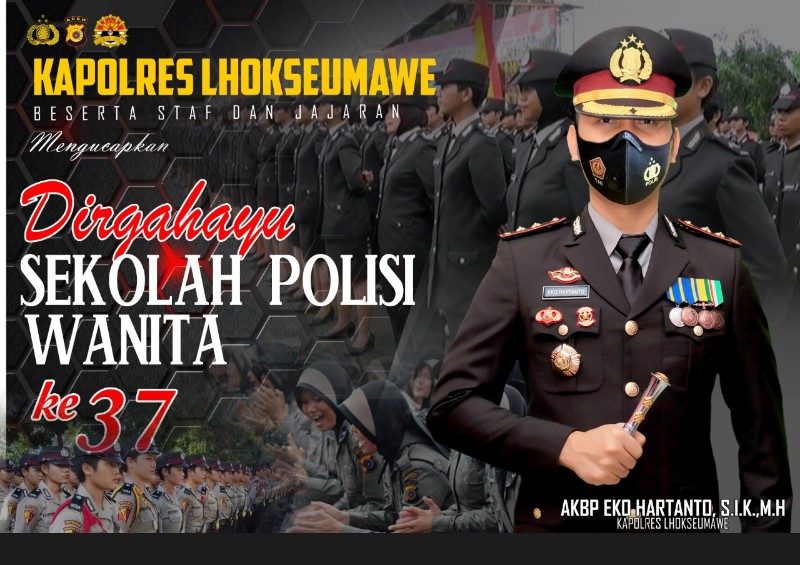 LHOKSEUMAWE-Kapolres Lhokseumawe AKBP Eko Hartanto, S.IK, MH beserta jajaran dan staf beri ucapan Dirgahayu Sekolah Polisi Wanita ke 37.