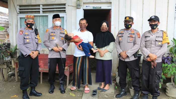 LHOKSEUMAWE – Kapolres Lhokseumawe, AKBP Eko Hartanto, SIK, MH menyambangi kediaman Albi Fahri Gading balita berumur 3 tahun dan Ibrahim Adam (63), warga Desa Uteun Bayi, Kecamatan Banda Sakti, Kota Lhokseumawe, Rabu (13/1/2021).