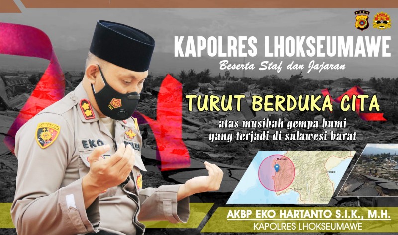 LHOKSEUMAWE – Kapolres Lhokseumawe AKBP Eko Hartanto, S.I.K, M.H, beserta staf dan jajaran hari ini, Jum’at ( 15/01/2021), menyampaikan duka cita yang mendalam bagi korban gempa di Sulawesi Barat (Sulbar).