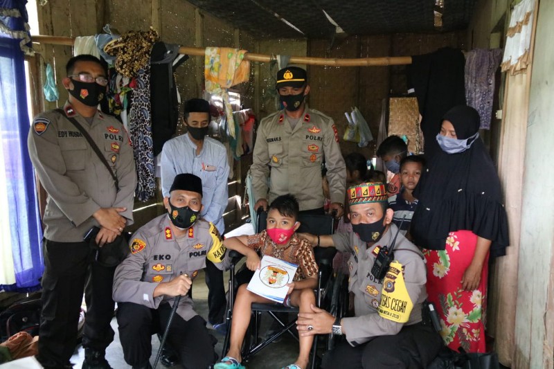 LHOKSEUMAWE – Kapolres Lhokseumawe AKBP Eko Hartanto, S.I.K, M.H berikan bantuan kursi roda, sembako dan santunan kepada Azizir Akbar (10 thn) di kawasan Desa Paloh Awe Kec. Muara Batu Kab. Aceh Utara, sabtu (09/01/2020) siang.