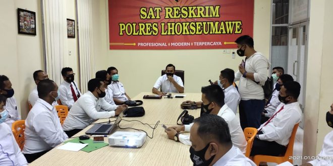 LHOKSEUMAWE – Polres Lhokseumawe bekali personil materi tentang Daktiloskopi umum Identifikasi yang berlangsung Aula Sat Reskrim Polres Lhokseumawe, sabtu (09/01/2021) pagi.