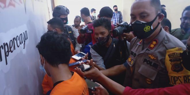Kapolres Lhokseumawe, AKBP Eko Hartanto SIk MH dalam konferensi pers di Mapolres Lhokseumawe, Jumat (8/1/2021) mengatakan, adapun inisial tersangka yang dibekuk pada Kamis (7/1/2021) yaitu, MA, BA warga Kecamatan Muara Satu, sedangkan satu tersangka lain yakni F yang juga warga kecamatan tersebut masuk dalam Daftar Pencarian Orang (DPO).