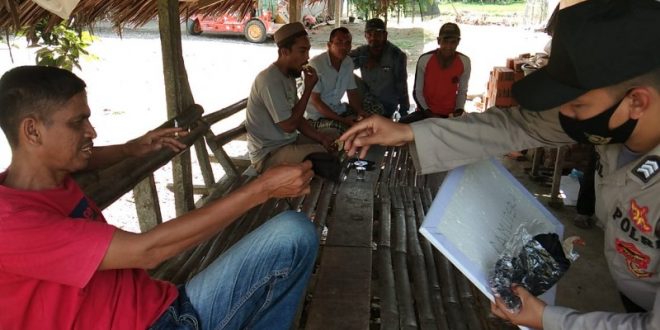 LHOKSEUMAWE – Guna mengantisipasi penyebaran Covid-19, Polsek Samudera bersama tim gabungan menggiatkan sosialisasi penggunaan masker kepada masyarakat, Jum’at (222/1/2021).