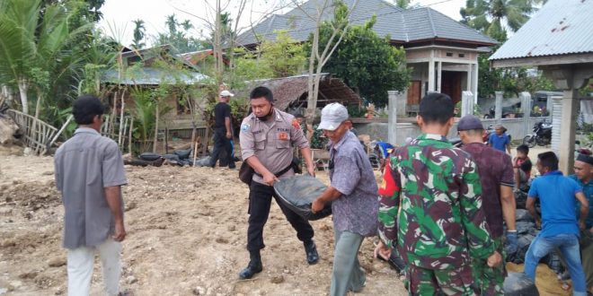 LHOKSEUMAWE – Polsek Samudera Bersama warga melakukan gotong royong.menimbun tanggul Krueng Pasee di Gampong Mancang, Kecamatan Samudera, Aceh Utara, wilayah hukum Polres Lhokseumawe, Jumat (29/1/2021).