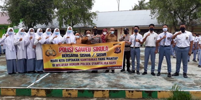 LHOKSEUMAWE – Polsek Syamtalira Bayu, Polres Lhokseumawe melaksanakan kegiatan “saweu sikula” di SMA Negeri 1 Syamtalira Bayu, Aceh Utara, Senin (18/1/2021. Dalam kegiatan itu, personil mensialisasikan protokol kesehatan dan bahaya Narkoba.