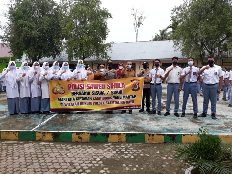 LHOKSEUMAWE – Polsek Syamtalira Bayu, Polres Lhokseumawe melaksanakan kegiatan “saweu sikula” di SMA Negeri 1 Syamtalira Bayu, Aceh Utara, Senin (18/1/2021. Dalam kegiatan itu, personil mensialisasikan protokol kesehatan dan bahaya Narkoba.