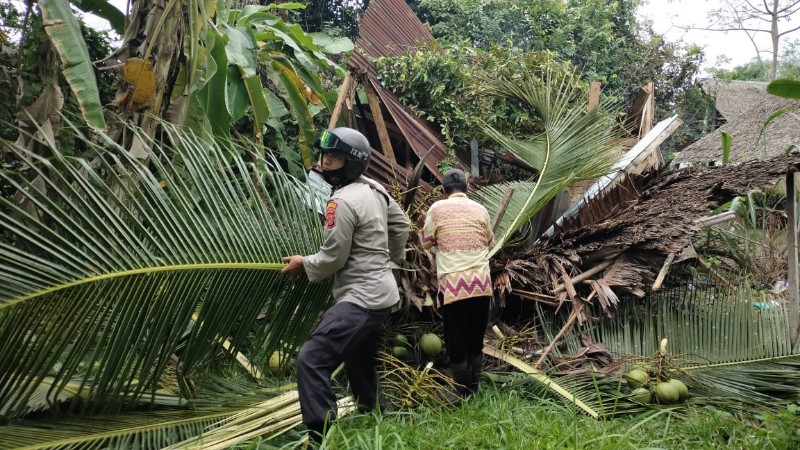 Pohon tumbang tersebut menimpa rumah Sarifah (68 thn) seorang janda yang tinggal sendiri dirumah tersebut. Saat ini sedang dilakukan pemotongan pohon kelapa maupun evakuasi barang barang rumah tangga yang masih dapat dipergunakan.
