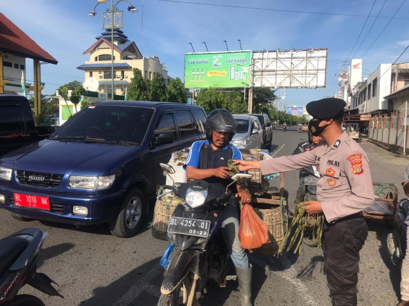 Ada puluhan masker yang diberikan kepada masyarakat pengguna jalan baik pengendara sepeda motor maupun becak yang tidak memakai masker saat berkenderaan.