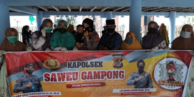 LHOKSEUMAWE – Saweu Gampong, Kapolsek Syamtalira Bayu melakukan sosialisasi pencegahan covid-19 kepada kaum rentan penularan virus covid-19 terhadap anak dan lansia di Meunasah Desa Blang Manjroen Kec. Syamtalira Bayu Kab.Aceh Utara, rabu (13/01/2021).