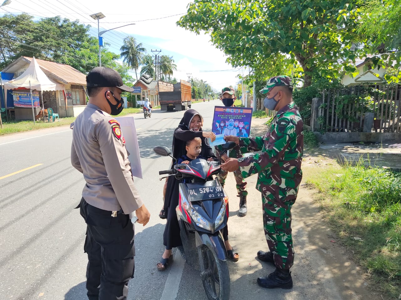 LHOKSEUMAWE – Personil Polisi dan TNI di Blang Mangat melakukan sosialisasi protokol kesehatan kepada masyarakat sekitar dan pengguna jalan raya, Minggu (10/1/2021), sosialisasi tersebut juga dilengkapi dengan alat peraga.