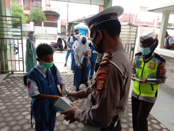 Kapolres Lhokseumawe, AKBP Eko Hartanto, SIK, MH melalui Kasat Lantas Polres Lhokseumawe, AKP Radhika Angga Rista, SIK mengatakan, selain sosialisasi prokes, personil juga memberikan penjelasan kepada siswa tentang tata tertib berlalu lintas.