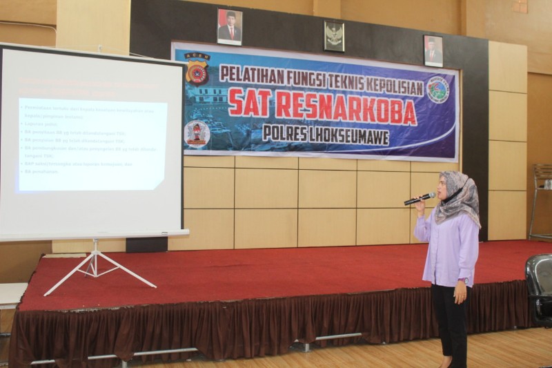 Pelatihan tersebut diikuti oleh personil Satnarkoba Polres Lhokseumawe serta perwakilan personil Polsek jajaran Polres Lhokseumawe. sementara pemateri disampaikan oleh Kbo Resnarkoba Polres Lhokseumawe Ipda Nina Ervianti, S.H.