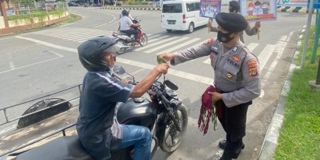 LHOKSEUMAWE – Sat Sabhara Polres Lhokseumawe memberikan puluhan masker kepada pengguna jalam dalam rangka mencegah penyebaran virus covid-19 yang berlangsung di jalan di Simpang Jam, Jalan Merdeka Kec. Banda Sakti Kota Lhokseumawe, selasa ( 02/02/2021) pagi.