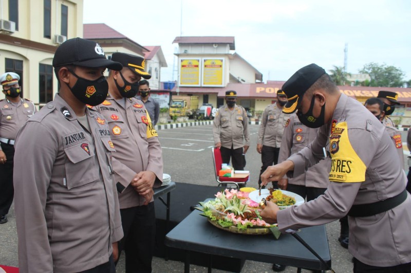Tampak dalam acara sederhana tersebut, Kapolres Lhokseumawe memotong tumpeng serta menyuapkan nasi tumpeng kepada bintara termuda dan tertua yang lahir pada bulan januari serta memberikan hadiah.
