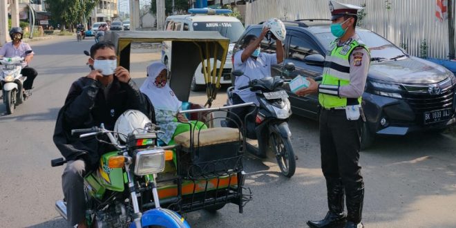 LHOKSEUMAWE – Polantas Polres Lhokseumawe berbagi masker kepada pengguna jalan di Lhokseumawe di depan Pos Lantas Kawasan Cunda, Kec. Muara Dua, Kota Lhokseumawe, Jum’at (05/02/2021).