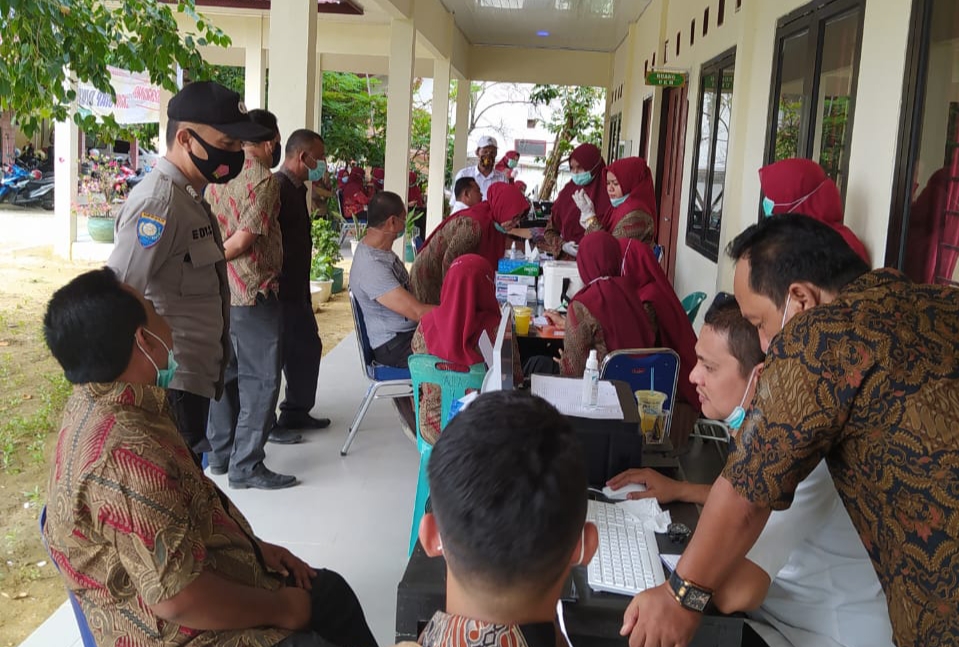 LHOKSEUMAWE – Hari kedua pelaksanaan vaksinasi para nakes, personil Polsek Banda Sakti, Polres Lhokseumawe siagakan sejumlah personil untuk pengamanan di Puskesmas setempat, Kamis (11/2/2021).