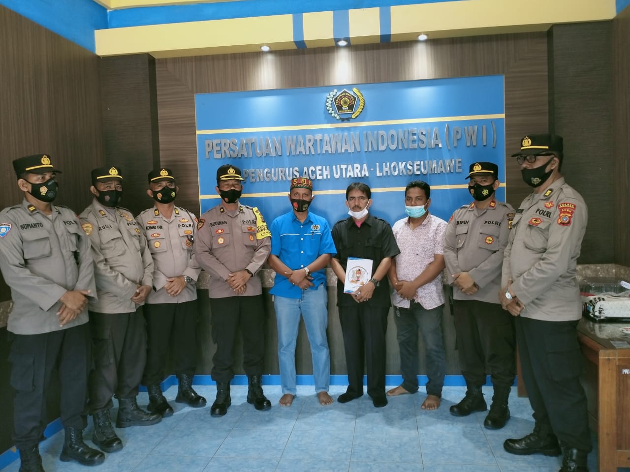 LHOKSEUMAWE – Polres Lhokseumawe menyambangi kantor sekretariat Persatuan Wartawan Indonesia (PWI) Aceh Utara – Lhokseumawe di Desa Mon Geudong, Kecamatan Banda Sakti, Kota Lhokseumawe, kunjungan tersebut dalam rangka memperingati Hari Pers Nasional (HPN) dan HUT organisasi PWI ke 75, Selasa (9/2/2021).