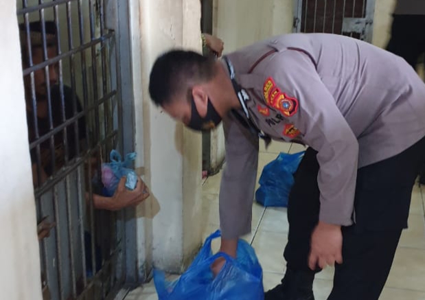 LHOKSEUMAWE – Kapolres Lhokseumawe AKBP Eko Hartanto SIK MH membagikan bingkisan kepada para tahanan Rutan Mapolres, bingkisan tersebut berupa susu dan buah-buahan, Senin (22/2/2021).