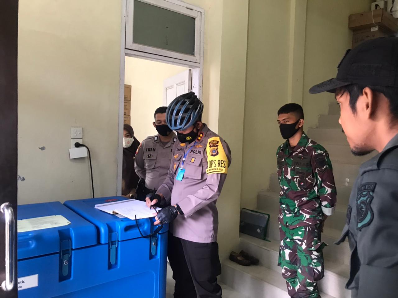 LHOKSEUMAWE – Kapolres Lhokseumawe AKBP Eko Hartanto SIK MH melakukan pengecekan pos pengamanan vaksin Covid-19 di kantor Dinas Kesehatan Kota Lhokseumawe, Selasa (2/2/2021).