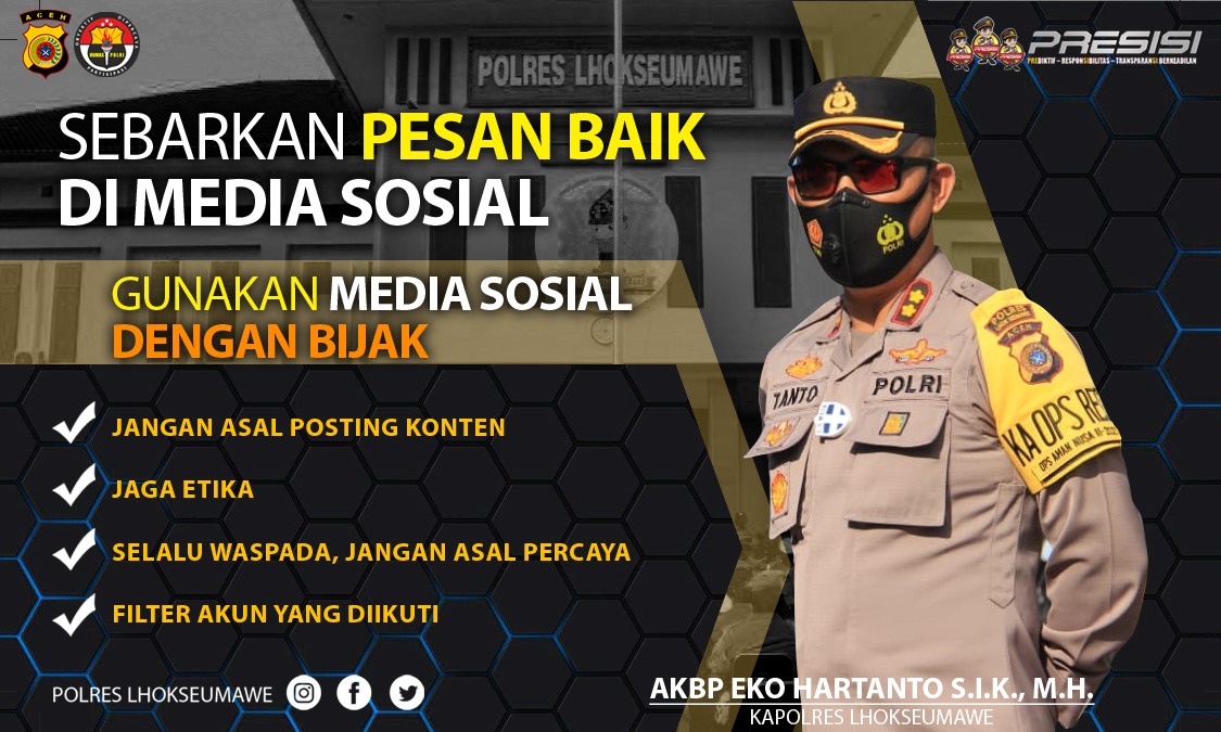 LHOKSEUMAWE – Kapolres Lhokseumawe AKBP Eko Hartanto SIK MH mengimbau masyarakat agar bijak dalam menggunakan media sosial dan jangan memposting sesuatu yang belum jelas sumbernya.