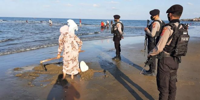 LHOKSEUMAWE – Tim Unit Reaksi Cepat (URC) Siagam Polres Lhokseumawe melaksanakan patroli di lokasi wisata Pantai Ujong Blang, Kec. Banda Sakti, Kota Lhokseumawe, Minggu (28/2/2021).