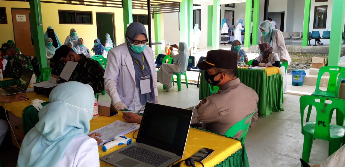 LHOKSEUMAWE – Proses penyuntikan Vaksin Sinovac di Kecamatan Dewantara, Aceh Utara, Wilayah hukum Polres Lhokseumawe berlangsung di dua tempat, Polsek Dewantara membagi personil menjadi dua tim untuk lakukan pengamanan, Rabu (10/2/2021).