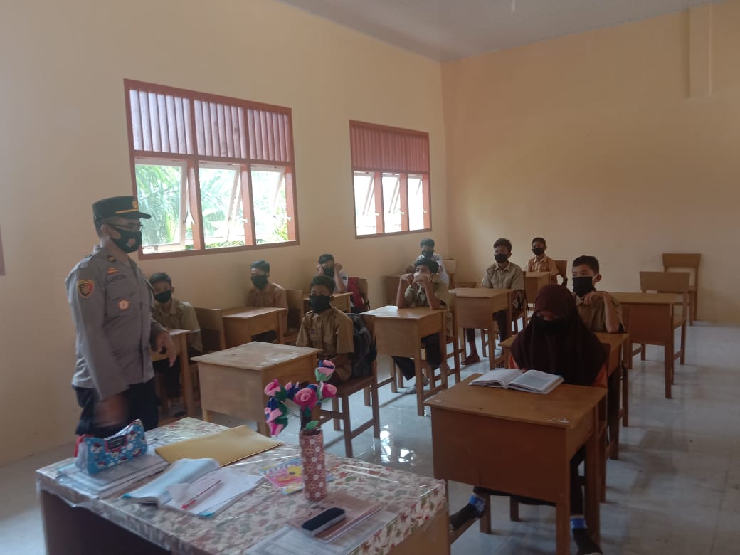 Begitu tiba di sekolah, kata Kapolsek, rombongan disambung oleh kepala sekolah, Adimah S.Pd dengan terlebih dahulu sebelum masuk ke lingkungan sekolah dicek suhu tubuh dan cuci tangan di tempat yang telah di sediakan.