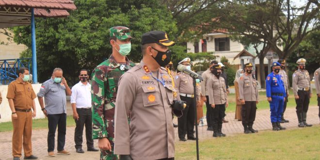 LHOKSEUMAWE – Polres Lhokseumawe bersama tim gabungan menggelar apel pembagian masker di lapangan Hiraq, Kecamatan Banda Sakti, Kota Lhokseumawe, apel tersebut dipimpin langsung oleh Kapolres Lhokseumawe, AKBP Eko Hartanto SIK MH, Selasa (2/2/2021) sore.