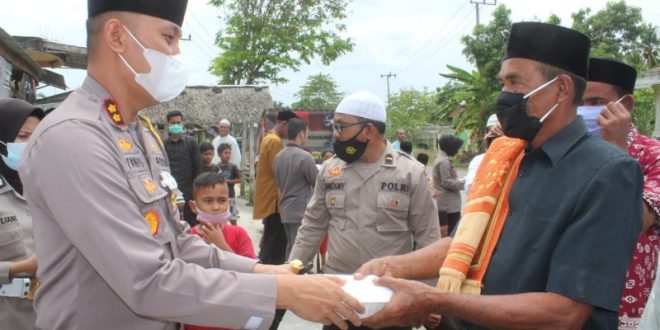 LHOKSEUMAWE- Polres Lhokseumawe menggelar Program Jum’at Baroqah dengan membagikan 300 Paket Nasi kepada Warga di Gampong Ule Nyeu Kec. Banda Baro, Kab. Aceh Utara, Jum’at (19/02/2021).