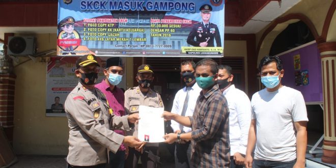 LHOKSEUMAWE – Polres Lhokseumawe launching program Surat Keterangan Catatan Kepolisian (SKCK) masuk gampong, kegiatan tersebut berlangsung di Keude Krueng Geukueh, Kecamatan Dewantara, Aceh Utara, Senin (15/2/2021).
