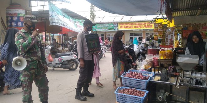 LHOKSEUMAWE – Polsek Blang Mangat, Polres Lhokseumawe melakukan sosialisasi gerakan wajib masker kepada masyarakat di tempat keramaian, personil juga menggunakan alat peraga, Sabtu (6/2/2021).