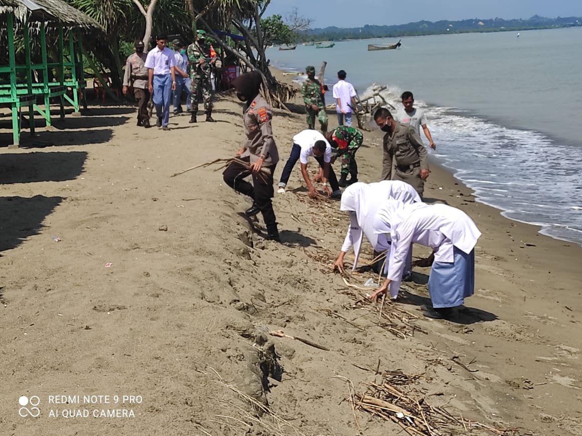 LHOKSEUMAWE – Polsek Syamtalira Bayu bersama personil TNI, petugas Puskesmas dan pemuda melaksanakan kegiatan gotong royong membersihkan sampah di sepanjang bibir pantai wisata Lancok, Senin (15/2/2021).