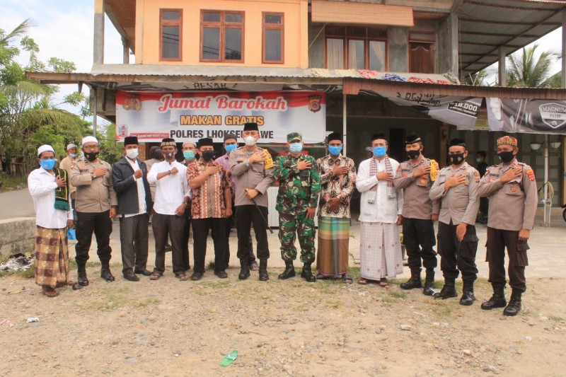 LHOKSEUMAWE- Polres Lhokseumawe menggelar Program Jum’at Baroqah dengan membagikan 300 Paket Nasi kepada Warga di Gampong Ule Nyeu Kec. Banda Baro, Kab. Aceh Utara, Jum’at (19/02/2021).