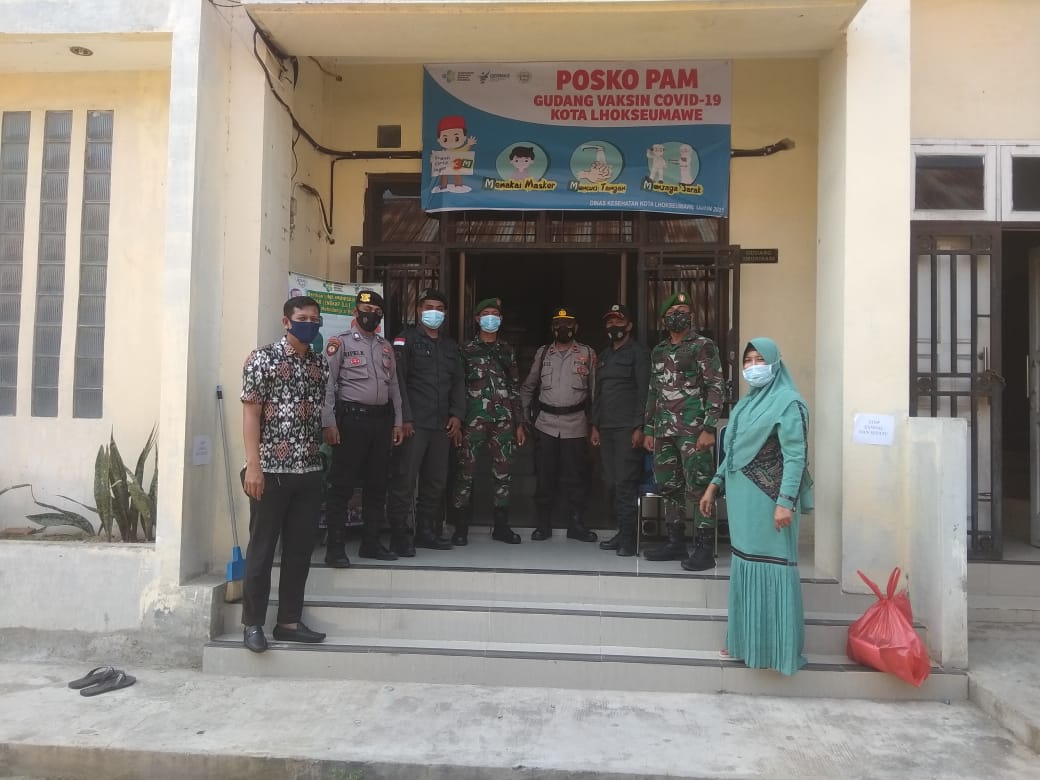 LHOKSEUMAWE – Personil Sat Sabhara Polres Lhokseumawe melakukan pengamanan gudang Vaksin Covid-19 di Kantor Dinas Kesehatan Kota Lhokseumawe, Kamis (4/2/2021).