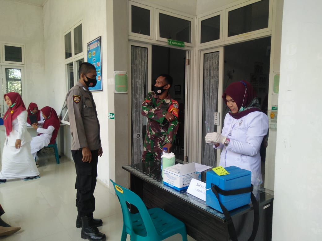LHOKSEUMAWE – Personil Polsek Banda Sakti siaga di Puskesmas Mon Geudong di hari kedua vaksinasi, tujuannya untuk memberikan rasa aman dan nyaman di lokasi tersebut, Kamis (11/2/2021).