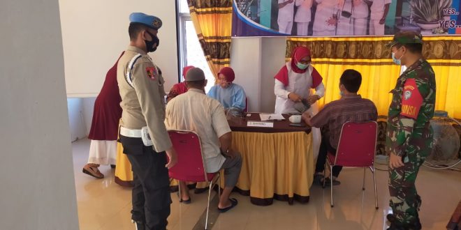 LHOKSEUMAWE – Terkait masih berlangsungnya proses vaksinasi terhadap Nakes di Puskesmas Mon Geudong, Kecamatan Banda Sakti, Kota Lhokseumawe, personil Polsek Banda Sakti masih tetap lakukan pengamanan, Sabtu (13/2/2021).