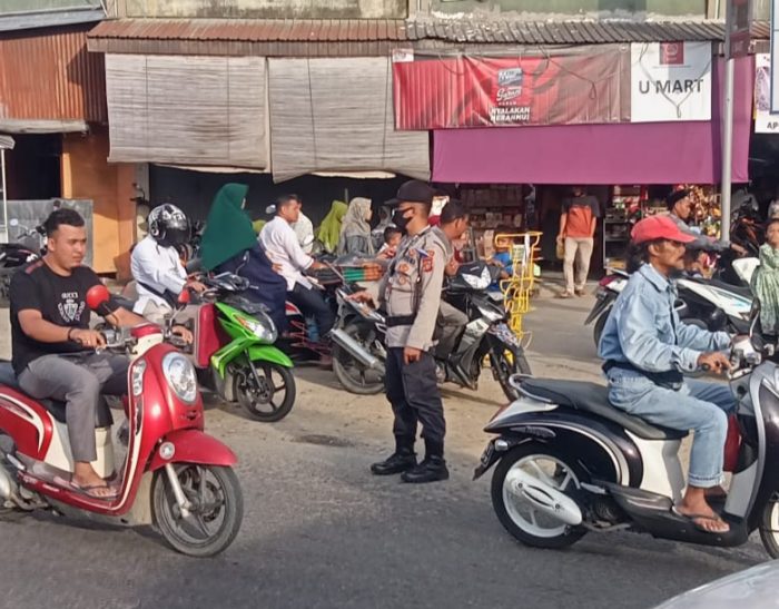 LHOKSEUMAWE – Guna memberi kenyamanan kepada masyarakat, personel Polsek Samudera Siaga di Keude Geudong Kecamatan Samudera, Aceh Utara dan mengatur lalu lintas di jalur nasional Medan-Banda Aceh, Jumat (16/4/2021).