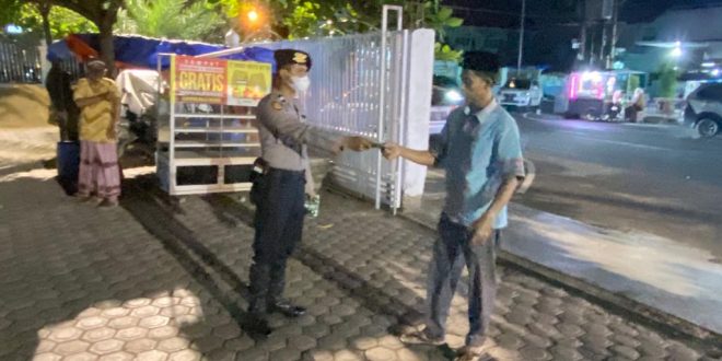 LHOKSEUMAWE – Guna mencegah penyebaran Covid-19 di lingkungan tempat ibadah, Tim URC Siagam Polres Lhokseumawe membagikan masker menjelang pelaksanaan ibadah shalat Isya dan tarawih di Masjid Jamik Kota Lhokseumawe, Rabu (28/4/2021) malam.