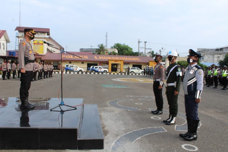 LHOKSEUMAWE- Kapolres Lhokseumawe AKBP Eko Hartanto, S.I.K, M.H memimpin langsung apel gelar pasukan Operasi Keselamatan Seulawah-2021 yang berlangsung di halaman Mapolres Lhokseumawe, senin pagi (12/04/2021).
